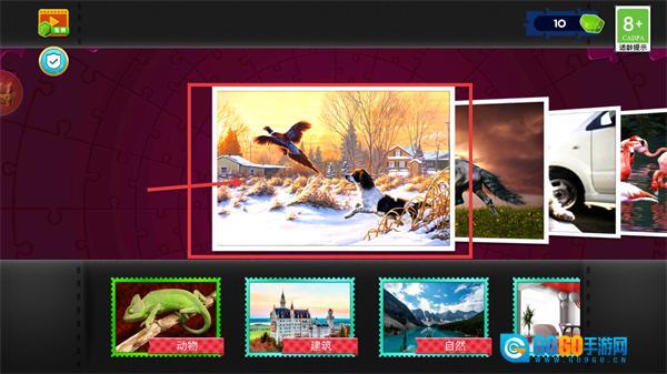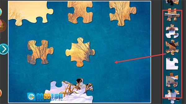 1、看到拼图选择界面后,点击被红色框选的动物类雪景拼图,进入对应的主题关卡,开启【35块】拼图的拼接挑战。