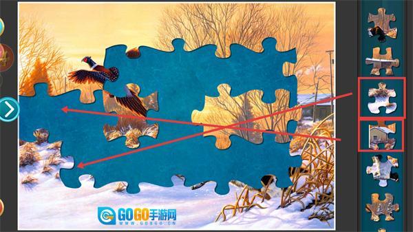 3、继续进行拼接操作时,把右侧用红色框标注出的拼图块,移动到左侧相对应的空缺位置,使雪景和动物元素的纹路相互衔接起来。