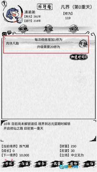 3、于修炼界面提升【体魄】等级,每次修炼会增加1点修为,当修为积累至20点时,即可将肉体凡胎进行升级。