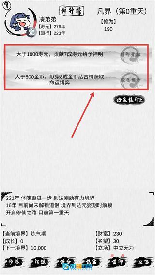 4、满足对应条件后,可选择信仰贡献或祭祀博弈的方式,通过消耗寿元或金币,来获取与命运相关的修炼机遇。