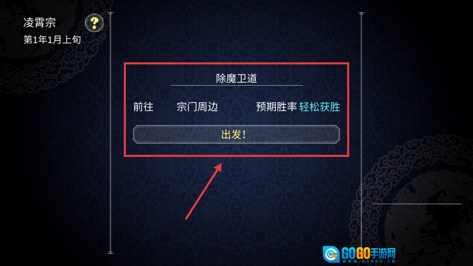 2、打开除魔卫道的任务界面,选定前往【宗门周边】的选项,当预期胜率显示为轻松获胜时点击出发,以此获取初始资源。