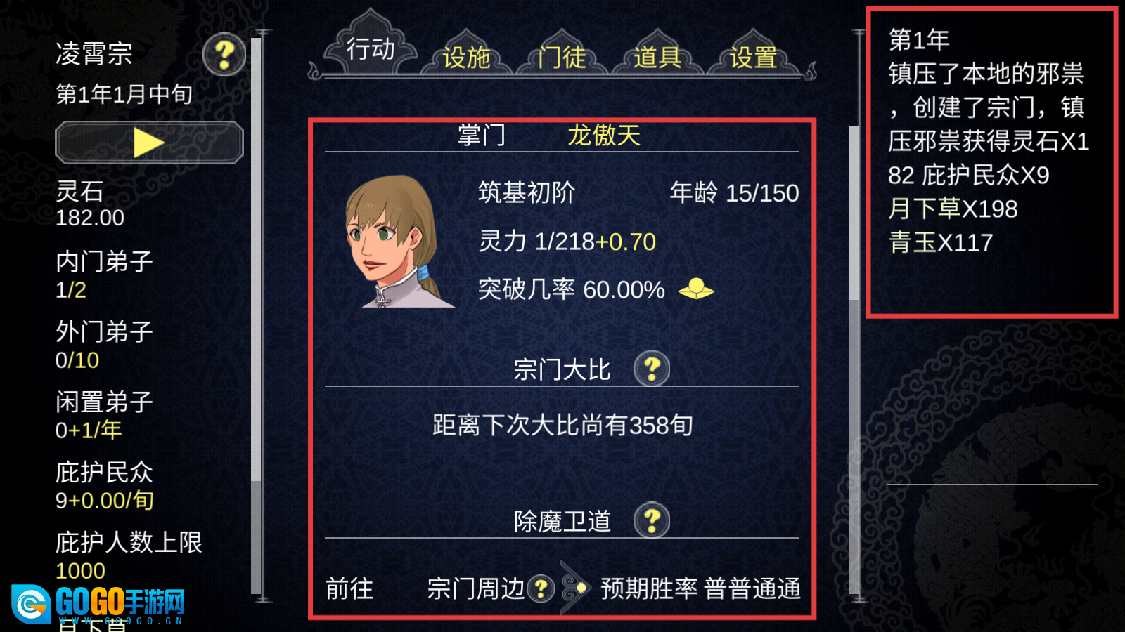 3、留意掌门【龙傲天】的状态及突破概率,关注宗门大比的具体时间,借助资源合理规划修炼进程与宗门发展方向。