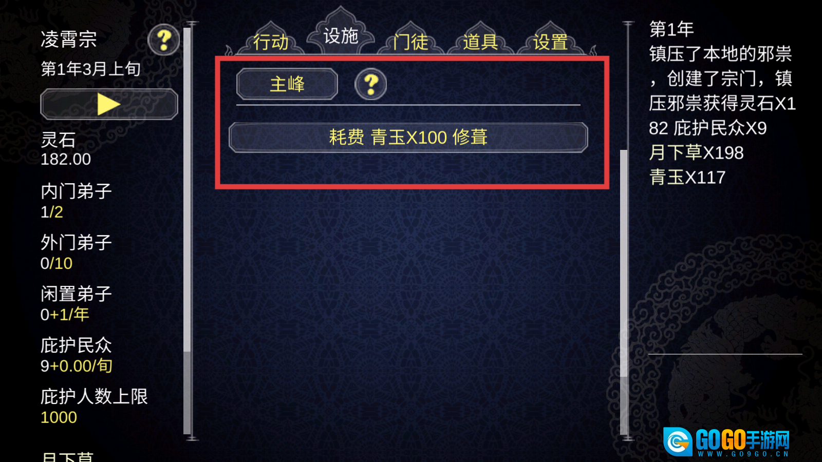 4、当积累到足够数量的青玉后,进入主峰界面,消耗【青玉×100】进行修缮操作,以此来提升宗门的基础功能和整体实力。
