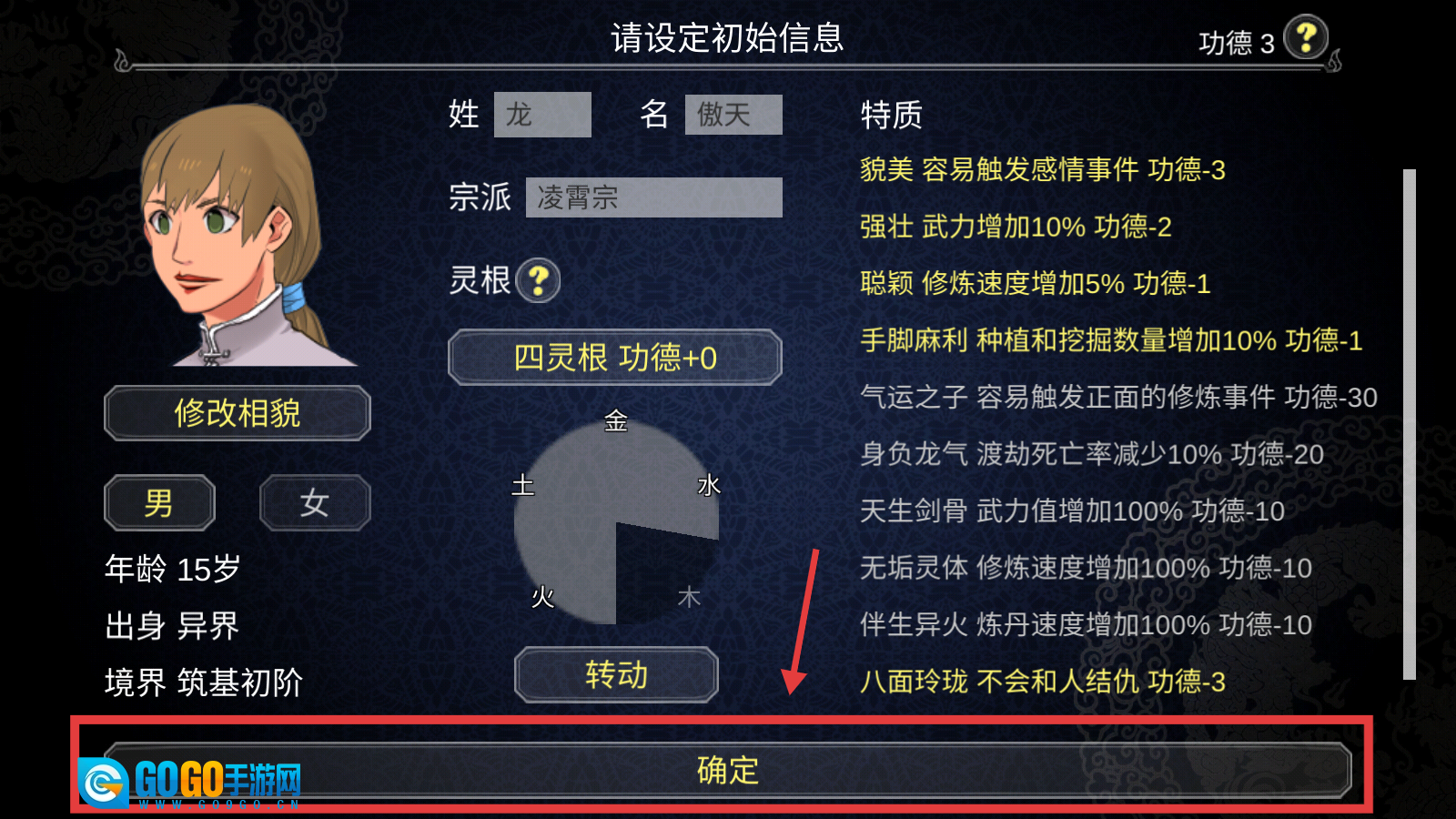 1、填写姓名【龙傲天】、宗派【凌霄宗】等初始信息,确认信息准确无误后点击确定,即可开启宗门修炼之旅。