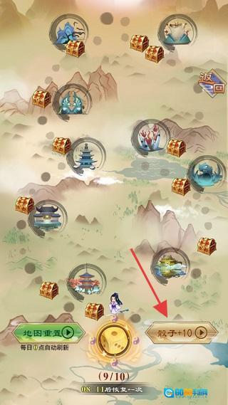 3、在地图界面,点击【骰子+10】按钮,消耗骰子开展地图探索,解锁新场景和奖励。