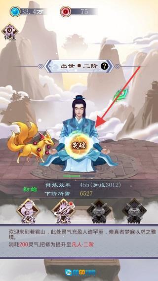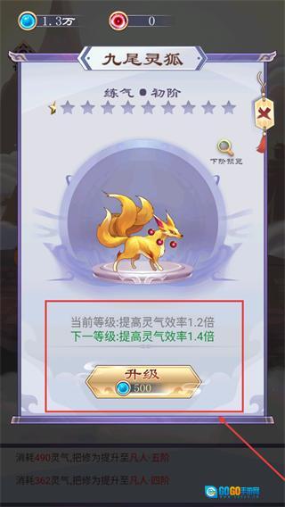3、消耗【500】灵气对【九尾灵狐】进行升级,能把灵气效率从1.2倍提高到1.4倍,让资源获取速度更快。
