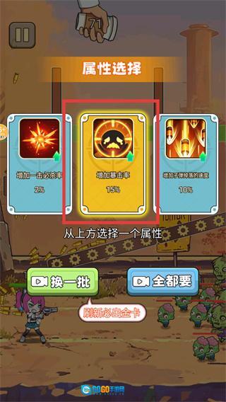 3、子弹掉落之后会顺着轨道移动,碰到倍数区域能够叠加增益效果,与此同时角色会自动攻击出现的僵尸。