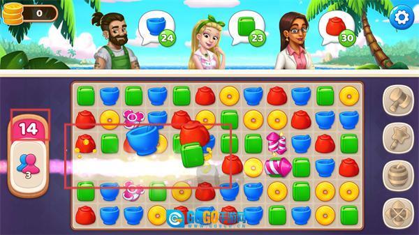 触发特效消除后,【杯子】剩余数量为【24】,【盒子】剩余数量为【23】,【红球】剩余数量为【30】,还剩【14】步可继续推进。
