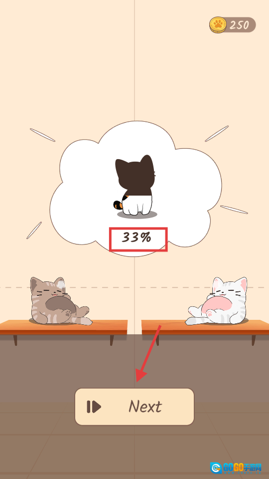 4、通过关卡后,界面会显示【33%】的进度和【250】的金币数量,此时点击【Next】按钮,即可进入下一个曲目继续进行挑战。