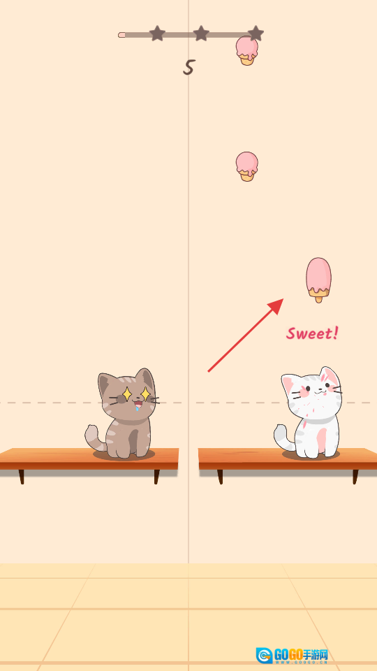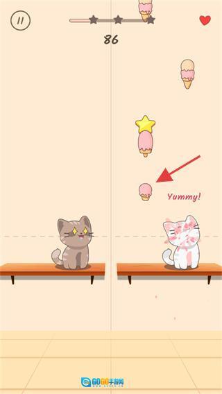 3、留意冰淇淋掉落的方位,迅速把猫咪移到其下方接住,即可获得【Sweet】评价;过程中要避开陷阱食物,避免被扣分。