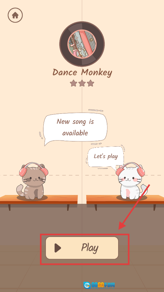 1、挑选【DanceMonkey】这首歌曲后,点击【Play】按钮,就能进入关卡,跟着音乐的节奏来操控两只猫咪去接取美食。