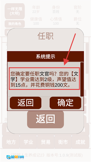 3、担任文官需满足【文学】等级达到2级、声望值积累至15点以及持有200文铜钱的条件,待各项要求均达成后确认任职,即可开启官场派系角逐与官职进阶的通道。