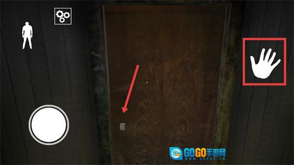 3、靠近门后点击右侧的【手掌】图标进行互动,尝试打开门,在此过程中要留意场景里的隐藏线索和道具。