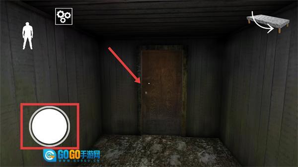 2、进入初始房间后,你可以借助左侧的圆形按钮来控制角色移动,朝着红色框所指向的门的方向行进,对场景展开探索。