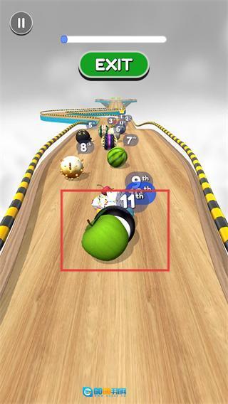 2、在赛道里操控【绿色苹果】类的球体向前行进,通过超越其他带有数字标识的球体来提高自己的排名。