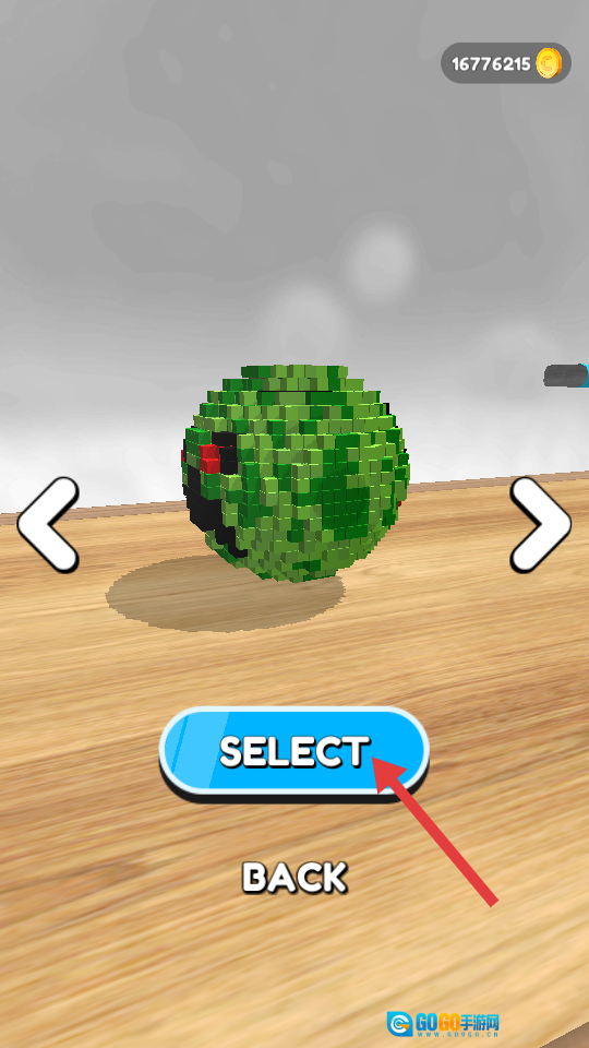 3、点击【SELECT】按钮,挑选已解锁的绿色像素球体,以便后续关卡使用。