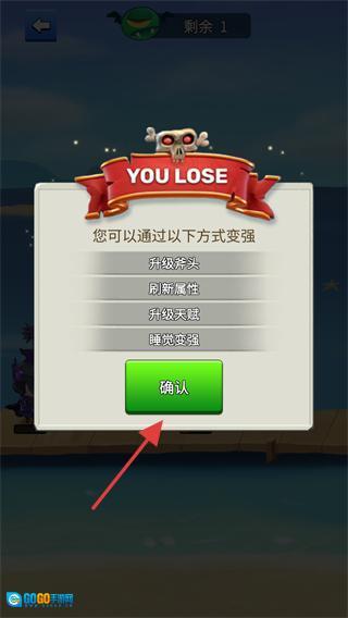 4、要是挑战失败弹出【YOU-LOSE】的提示,点击【确认】按钮把弹窗关掉,之后可以通过升级之类的办法提升实力再重新挑战。