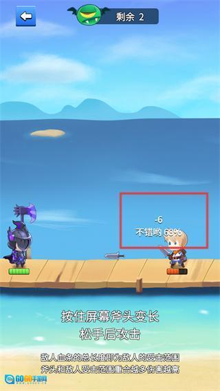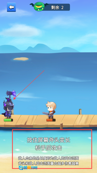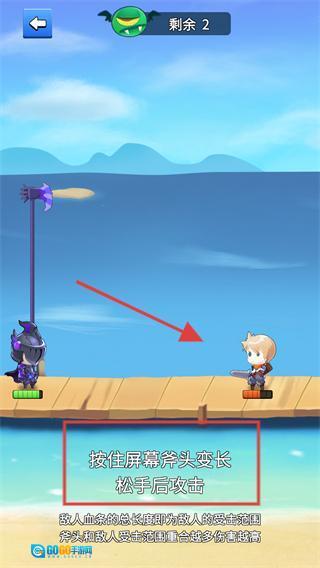 2、按照提示【按住屏幕使斧头变长-松手后发起攻击】来操作,以此控制角色斧头的长度,攻击敌方角色。