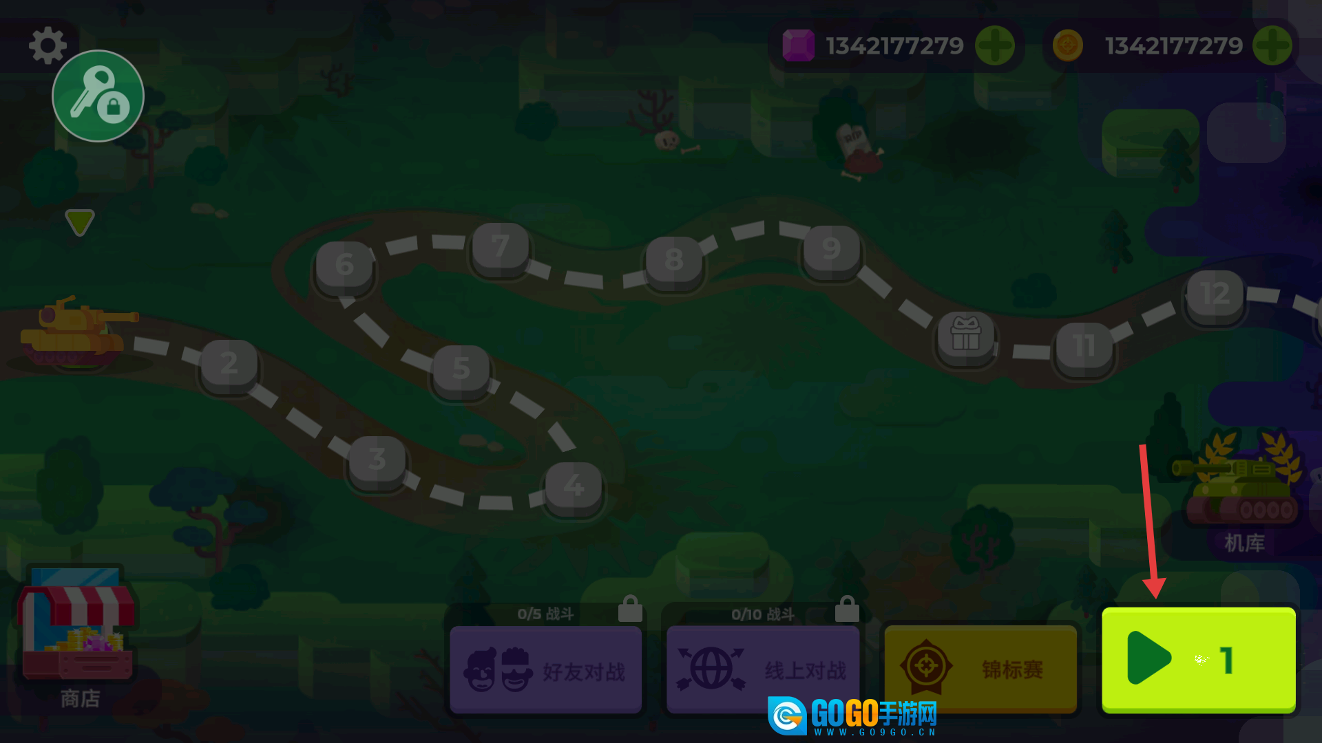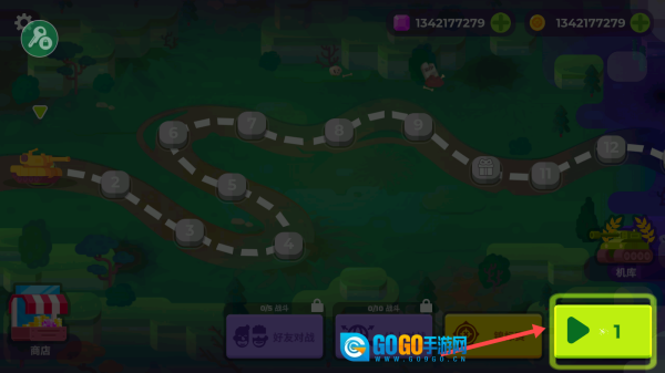 1、选定路径节点后,点击【绿色开始按钮】即可进入对战模式,期间可前往【商店】获取道具以提升战力。