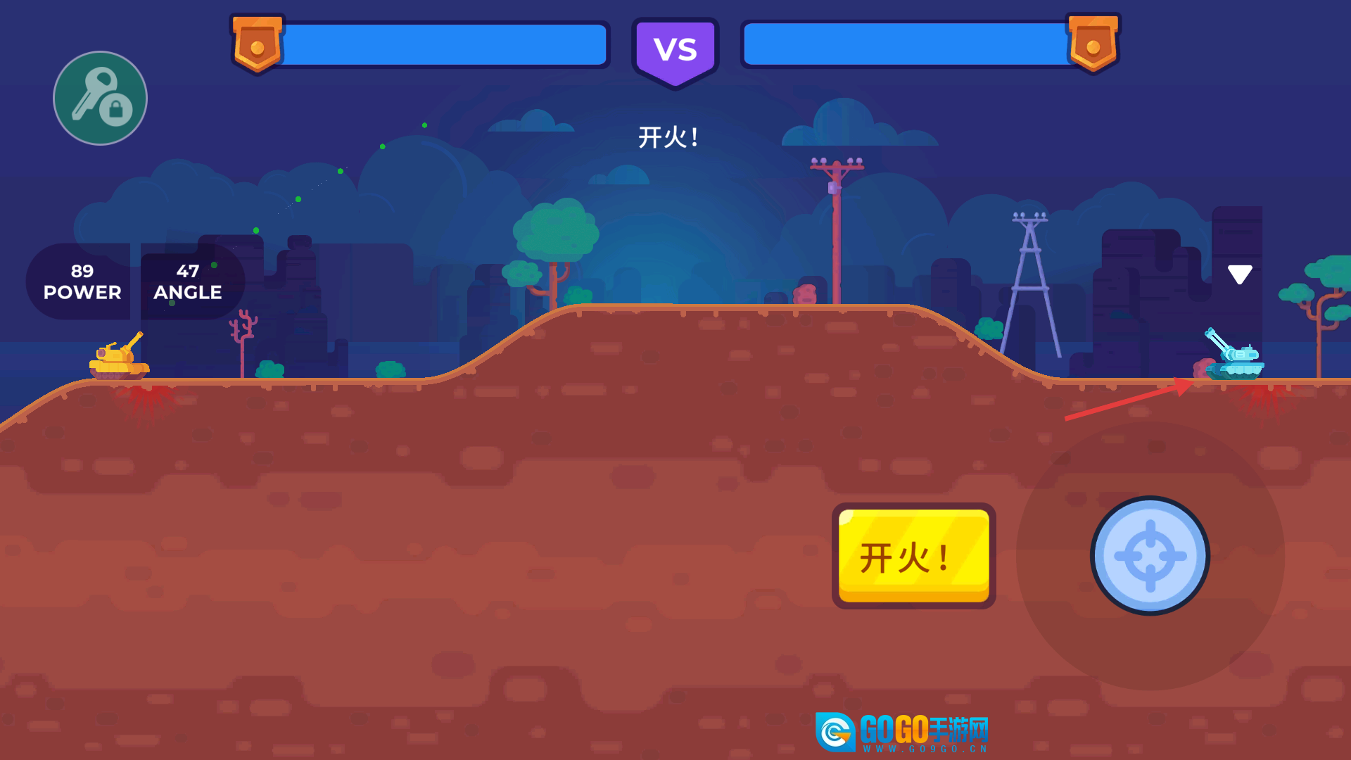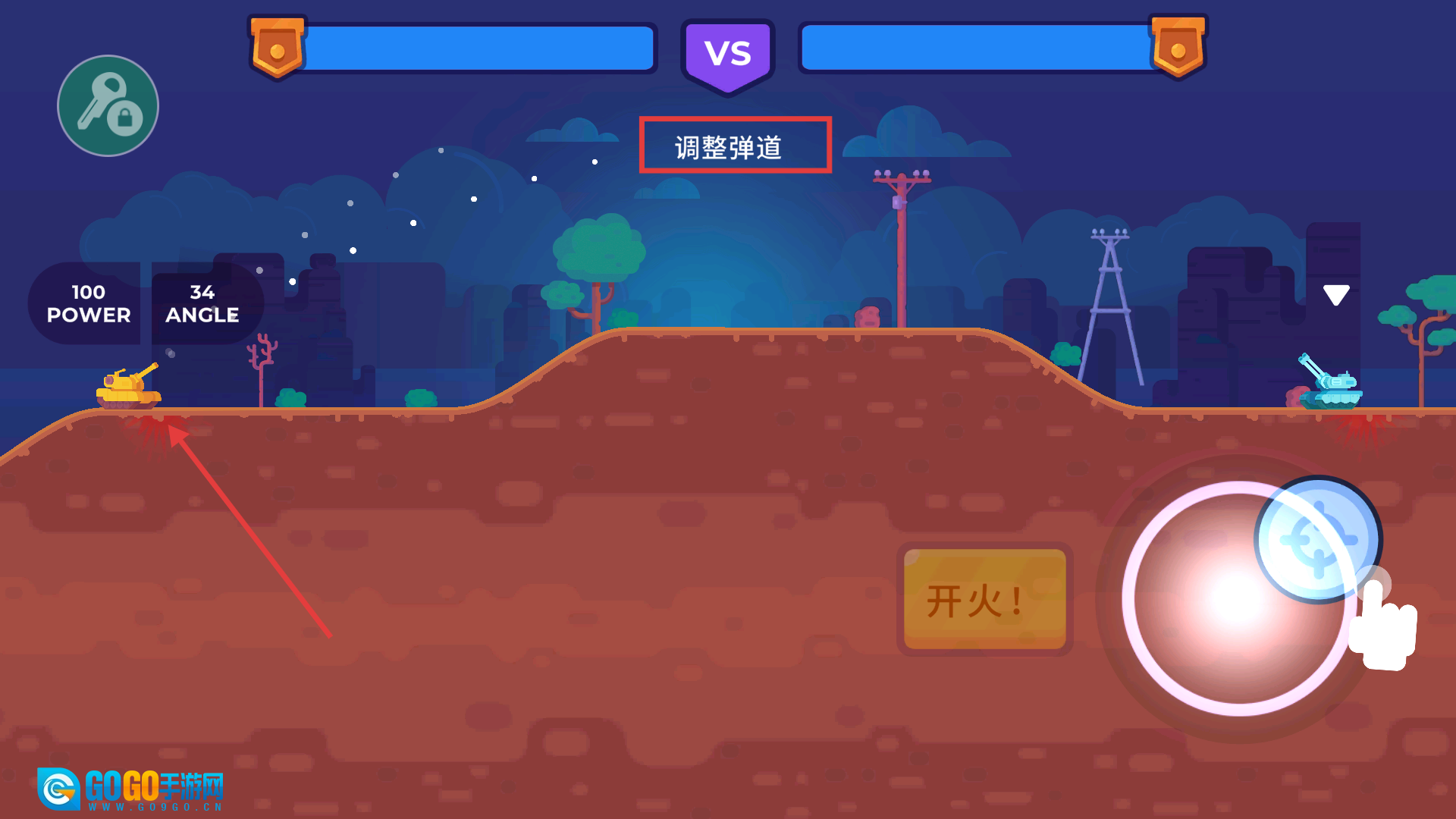2、点击右下角的图标来调整弹道,之后点击【开火】按钮对敌方坦克进行轰炸