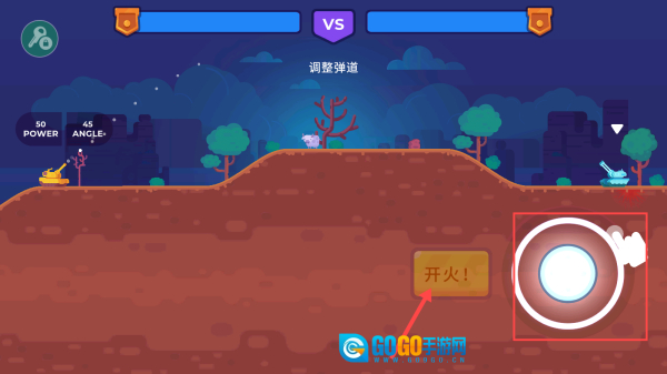 3、当【开火按钮】呈现黄色时,可再次对【角度】与【力量】进行调整,随后精准点击该按钮发动二次攻击,以此进一步扩大对战优势。