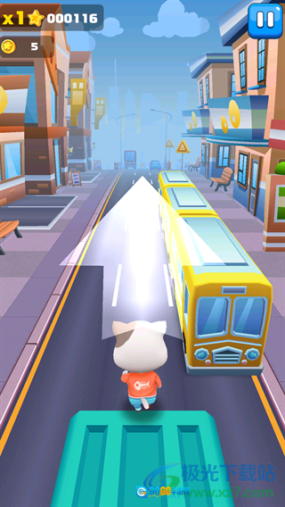 2、当碰到【红色巴士】和【橙色小车】这类障碍时,调整角色的位置从它们之间的空隙穿过去,以此维持酷跑的节奏。