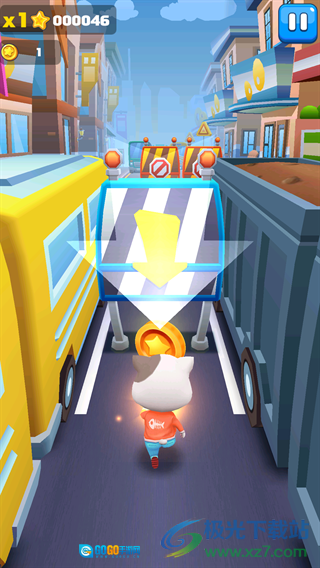 1、控制角色在道路上奔跑,避开【禁止标识路障】和车辆,与此同时收集散落的【金币】,收集的累计数量会显示在左上角。