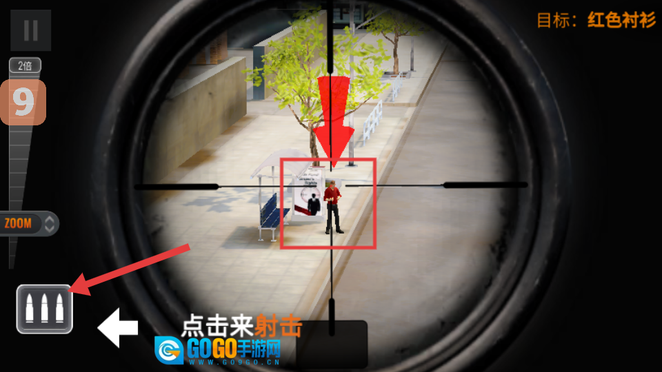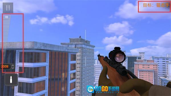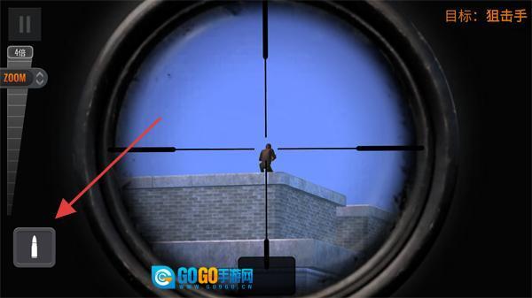 3、借助狙击镜锁定屋顶的【狙击手目标】,点击左侧的【子弹】按钮来完成射击动作。