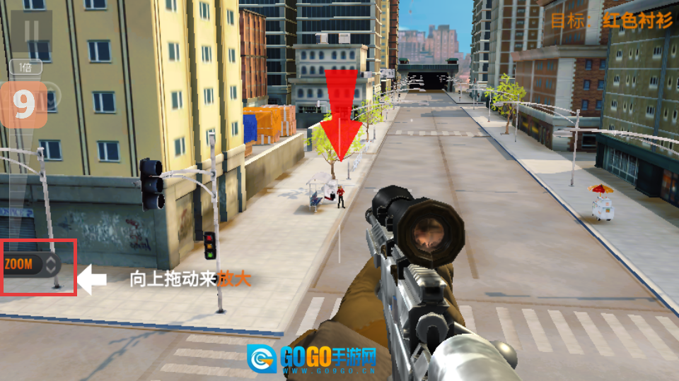 2、切换至狙击视角后,右上角会出现【目标:狙击手】的提示,此时需瞄准远处建筑物屋顶上的目标人物。