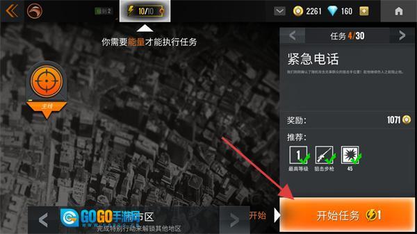 1、消耗【1点能量】后点击【开始任务】按钮,承接【紧急电话】任务,前往指定目标区域完成狙击任务。