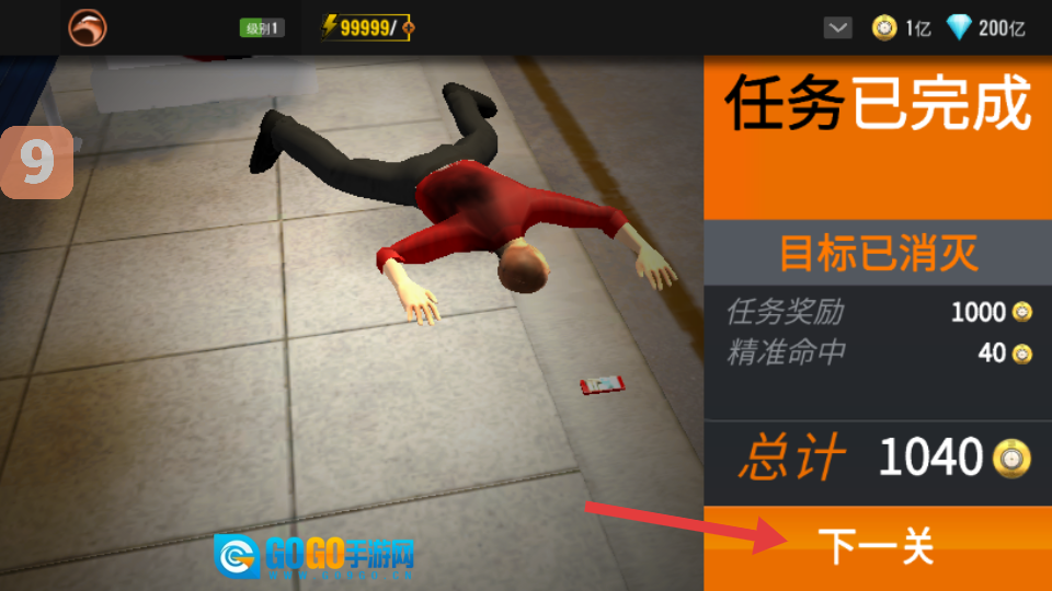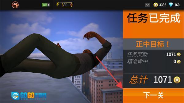 4、成功击中目标后任务即完成,界面会展示【总计1071金币】的奖励提示,点击【下一关】按钮即可开启新的挑战。