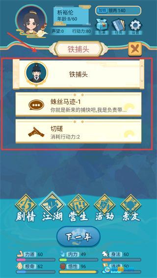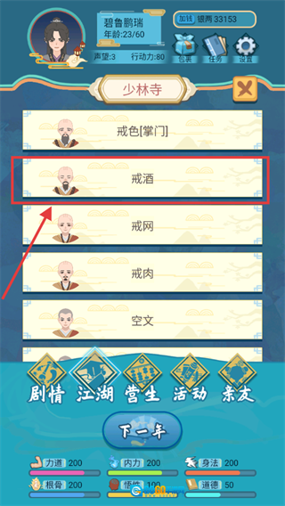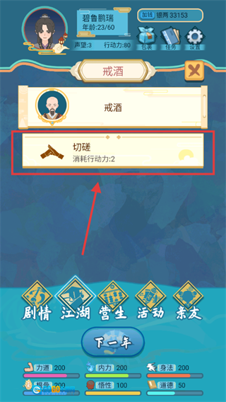 4、和【戒酒】进行切磋,会消耗【2】点行动力,能够提升自身的武学实力,建议大家好好把握并合理利用这个机会。