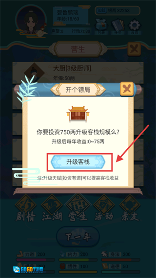 1、投入【750】两用于客栈升级,升级完成后客栈每年可带来【0】至【75】两的收益,以此帮助积累资金,推动角色发展。