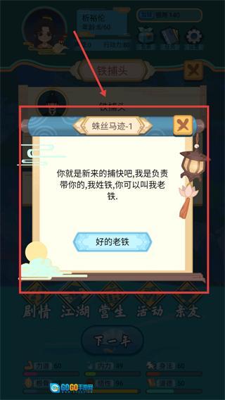 2、和铁捕头进行互动时,选择“蛛丝马迹-1”这个选项,就能开启新手引导任务,借此了解捕快的职责,同时推动剧情往下发展。