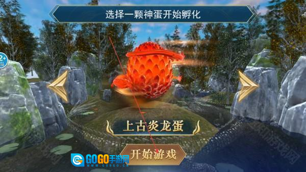 2、在神蛋选择界面,选择【上古炎龙蛋】等神蛋,点击【开始游戏】进入游戏世界。