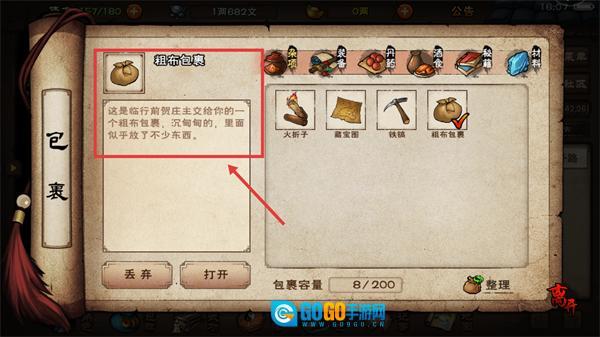 1、开启【粗布包裹】领取【火折子】【藏宝图】【铁镐】等道具,为后续的探索行动和任务开展完成前期筹备。