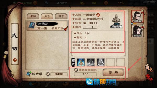 2、通过修炼【吐纳功】,能够提升角色的气血与聚气属性,从而增强其基础能力,为后续应对战斗和剧情挑战提供助力。