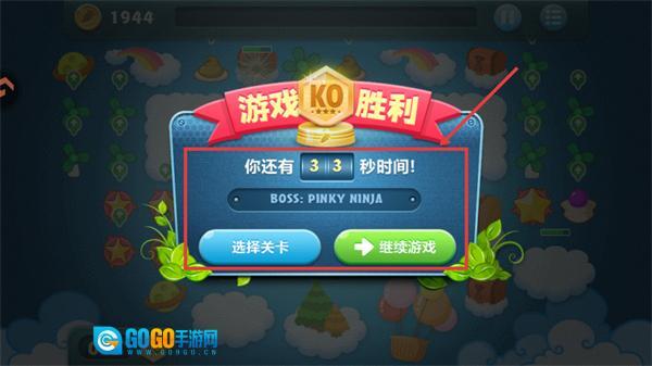4、战胜【PINKYNINJA】取得【游戏KO胜利】,还剩【33秒】时,可选择【继续游戏】或者【选择关卡】。