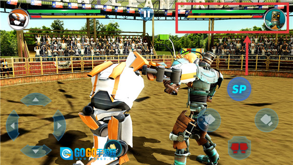 4、战斗过程中,通过方向键操控机器人;当攻击积累足够怒气后,点击【SP】按钮即可释放必杀技,以此击败对手。