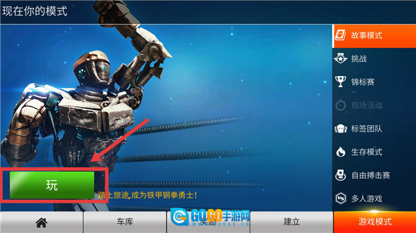 1、点击界面上绿色的【玩】按钮,就能进入游戏模式选择界面,选择【故事模式】即可开启机器人拳击的冒险之旅。