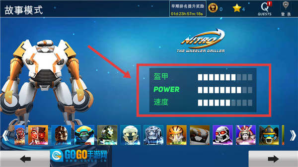 3、进入机器人选择界面后,浏览并挑选具备不同【盔甲】-【POWER】-【速度】属性的机器人,以备战战斗。