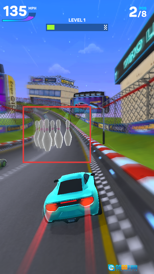 2、在赛道里避开保龄球瓶障碍物,让赛车持续行驶,推进比赛进程。