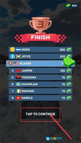 4. 比赛结束后查看排名奖励,玩家获得【第三名】对应的金币,点击底部的【TAPTOCONTINUE】按钮即可继续后续流程。