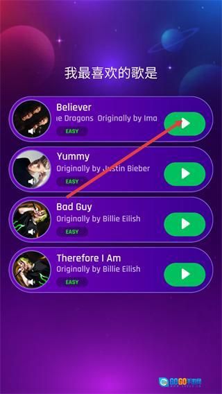 1、挑选自己喜爱的歌曲进入游戏界面,点击绿色按钮启动游戏,之后根据音乐的节奏来完成相应操作。