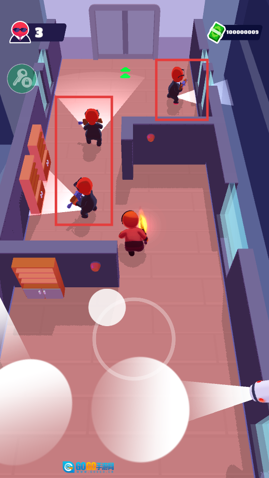 3、进入游戏后,操控角色躲避摄像头防止被察觉,之后把红框内的敌人都消灭掉。