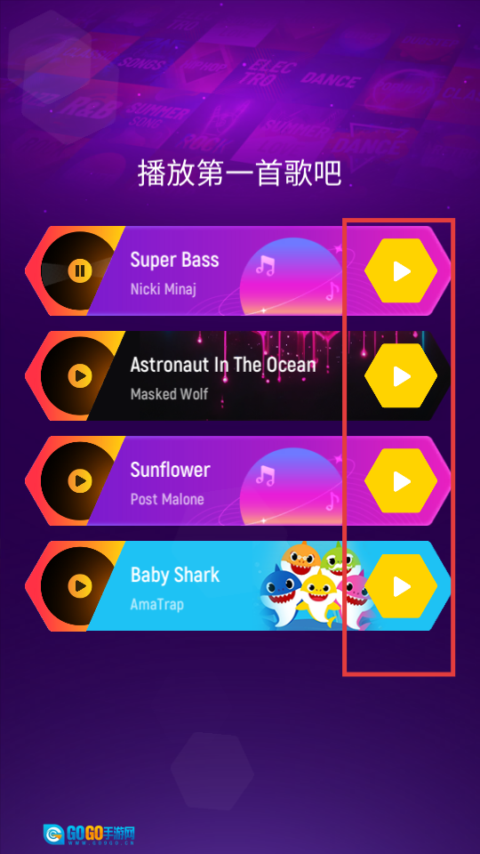 1、挑选你想播放的歌曲,点击歌曲右边的黄色播放按钮,即可启动游戏。