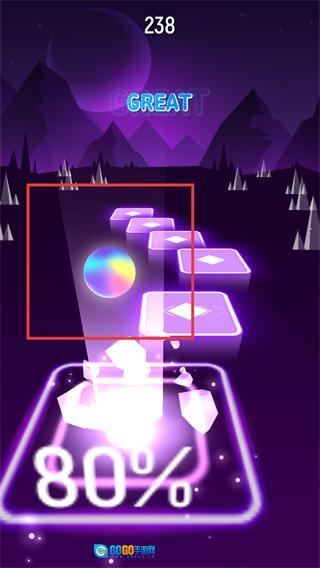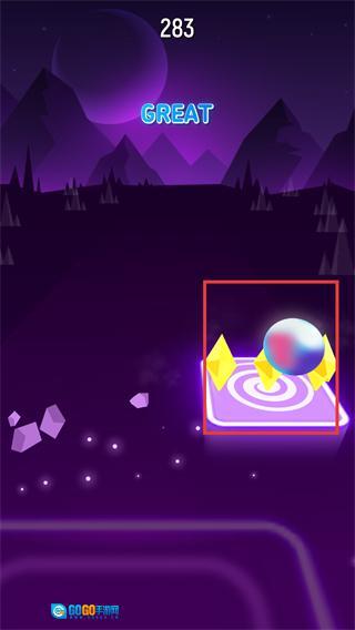 1、操控彩色球体沿着紫色方块构成的路径移动,避开障碍物并维持行进进度,触发GREAT判定能够提高关卡的完成效率。