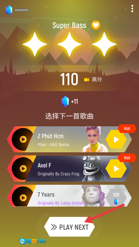 4、完成一首歌曲的关卡后,点击【PLAY-NEXT】按钮,即可继续挑战下一首歌曲。