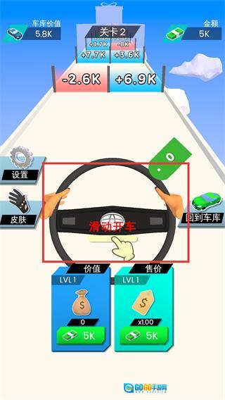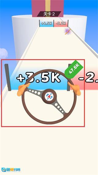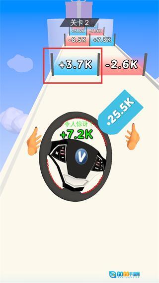 1、滑动方向盘启动游戏,操控车辆选择路径上标有【-2.6K】至【+6.9K】的区域,积累对应金额以解锁关卡挑战。