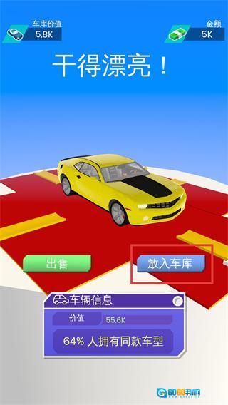 4、通关之后点击【放入车库】按钮,把黄色跑车存进去,这样既能提升车库的价值,也能为接下来的挑战做好准备。